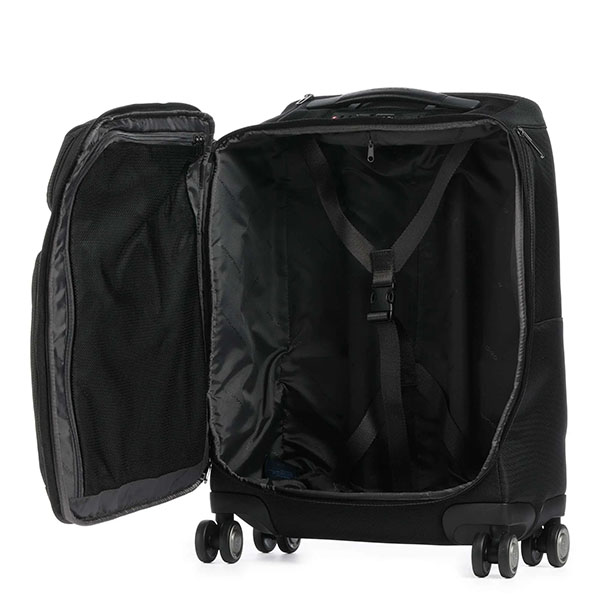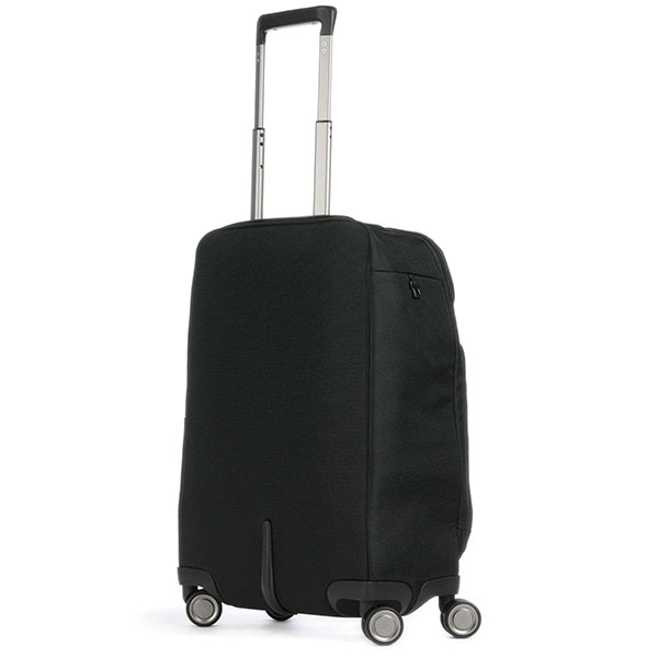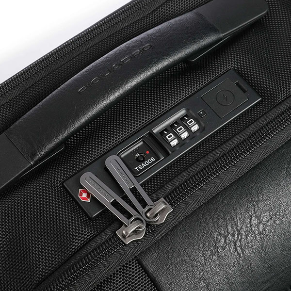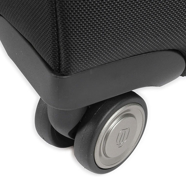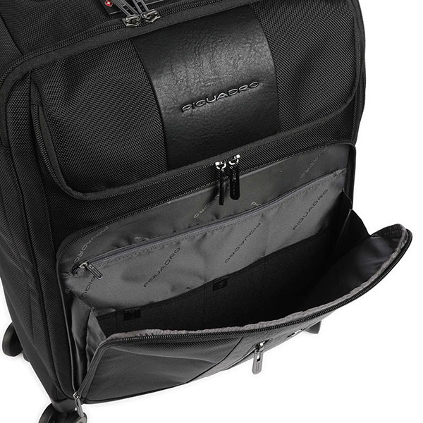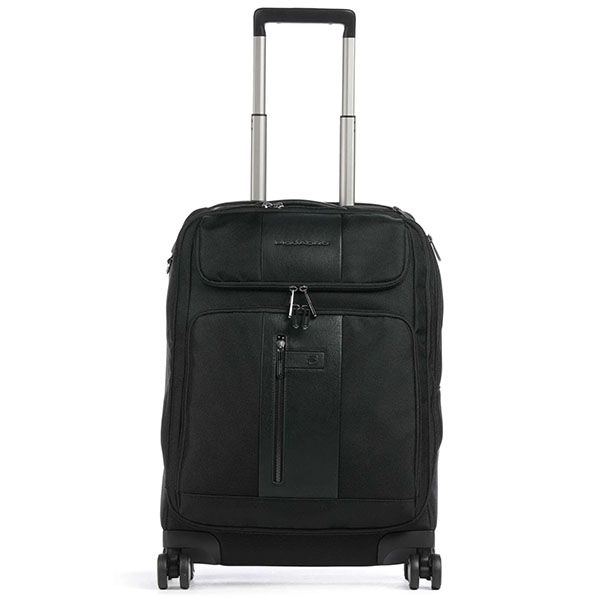 Чемодан из нейлона и кожи на четырех колесах из коллекции Piquadro Brief. Чемодан имеет одно вместительное отделение с натяжными ремнями и карманом на молнии. Габариты подходят для ручной клади в салон самолета.