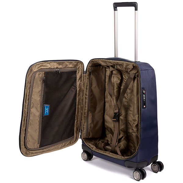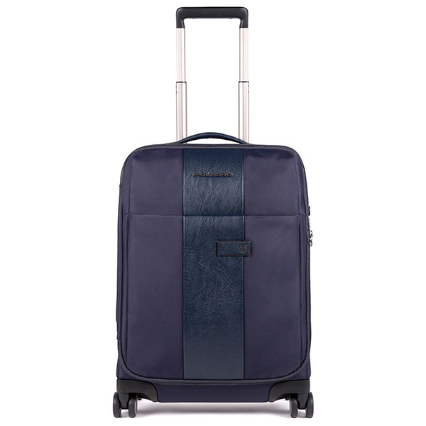 Чемодан из нейлона и кожи на четырех колесах из коллекции Piquadro Brief. Чемодан имеет одно вместительное отделение с натяжными ремнями и карманом на молнии, обладает несколькими ручками для удобства транспортировки. Вес чемодана 2690 гр. Объем: 40 литров. Габариты подходят для ручной клади в салон самолета.