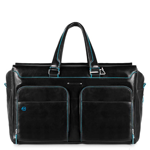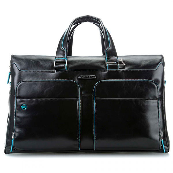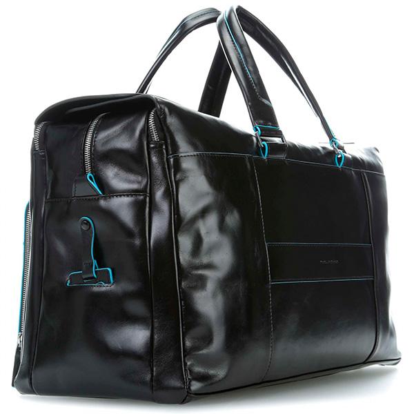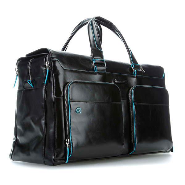 Кожаная дорожная сумка Piquadro из коллекции Blue Square. Сумка изготовлена из мягкой телячьей кожи с восковой пропиткой и фирменным голубым кантом. Имеет одно большое-основное отделение, куда с легкостью поместятся Ваши вещи, а также еще два отделения, одно из которых предназначено для 15 дюймового ноутбука и планшета, а второе для документов. Все три отделения на молнии и закрываются клапаном на магните. На передней части дорожной сумки расположены карманы на молнии с отсеками для письменных принадлежностей и телефона. Сбоку расположены отсек для зонта и адресная бирка. В комплекте идет плечевой ремень, для удобства переноски. Очень функциональный и удобный вариант премиальной дорожной сумки для бизнес командировок.
