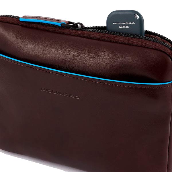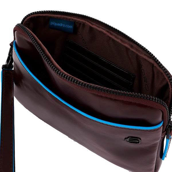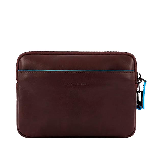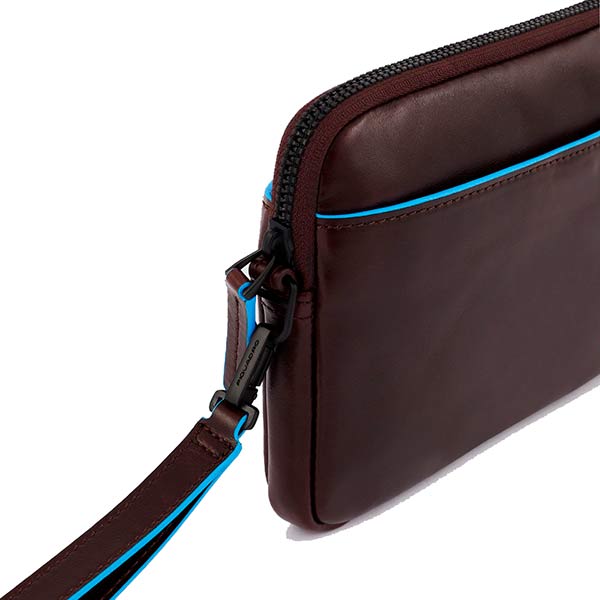 Клатч кожаный из коллекции Piquadro Blue Square. Изготовлен из мягкой телячьей кожи с восковой пропиткой и голубым кантом. Клатч имеет 1 отделения на молнии и внешние карманы, в основном отделении располагаются кармашки для 3 банковских карт, а так же можно положить телефон.