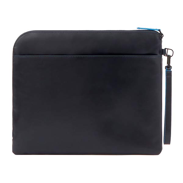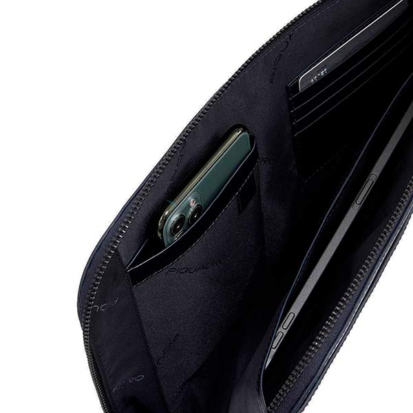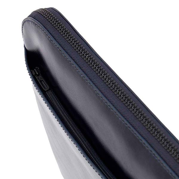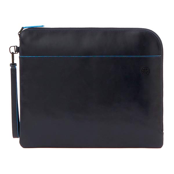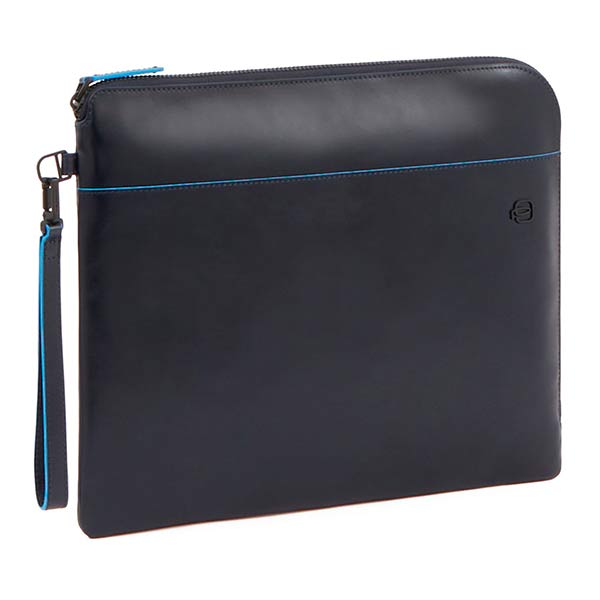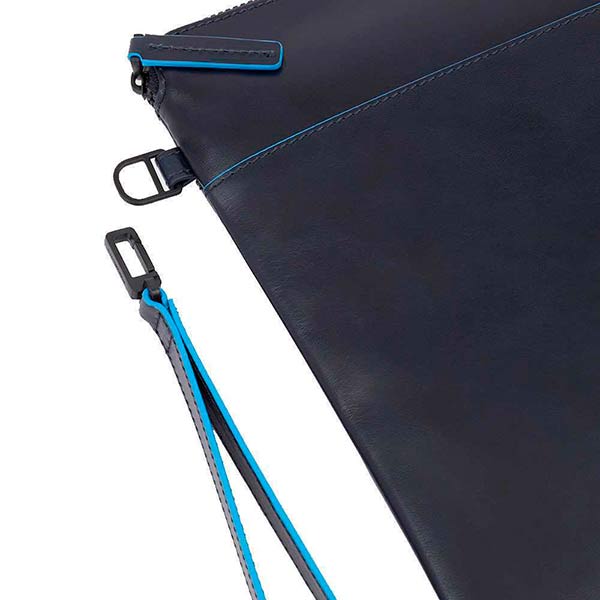 Клатч кожаный из коллекции Piquadro Blue Square. Изготовлен из мягкой телячьей кожи с восковой пропиткой и голубым кантом. Клатч имеет 1 отделения на молнии и внешний карман, в основном отделении располагаются отсек ipad, а так же можно положить телефон.