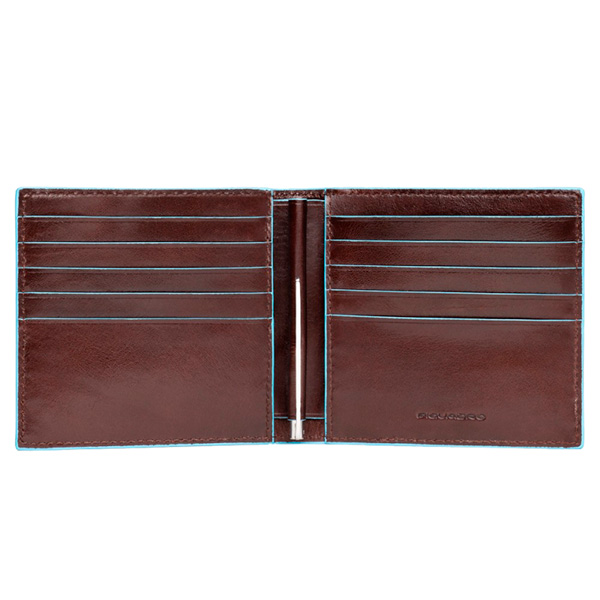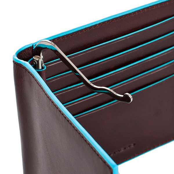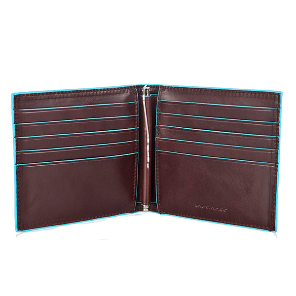 Стильное кожаное портмоне с зажимом для купюр и отделениями для кредитных карт. Мягкая телячья кожа и бирюзовая окантовка являются фирменной особенностью наиболее популярной в России коллекции Blue Square от компании Piquadro.