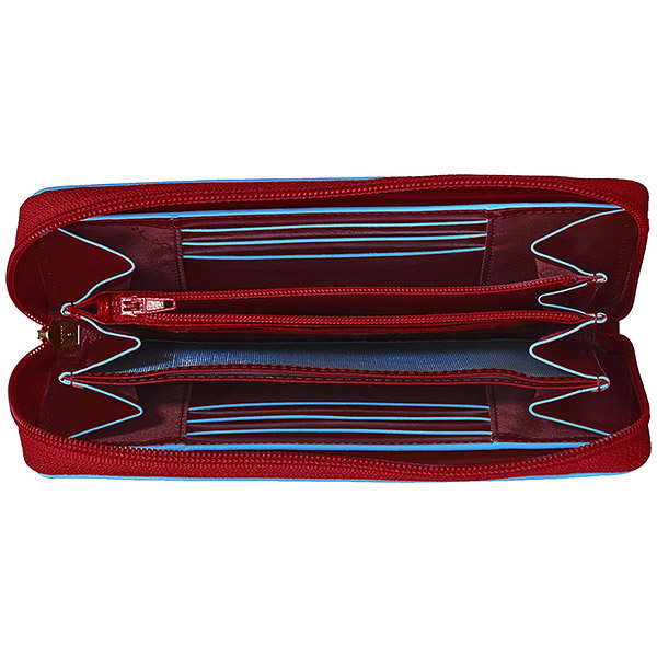 Женский кошелек с тремя отделениями, застежкой-молнией, отделениями для мелочи и кредитных карт от компании Piquadro, коллекция Blue Square. Материал - натуральная телячья кожа красного цвета.