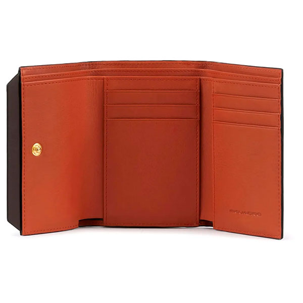 Женский кошелек из коллекции Piquadro Circle, изготовленный из натуральной кожи с кнопкой-застежкой, отделениями для кредитных карт, двумя отделениями для наличных и внешним карманом для монет на молнии.