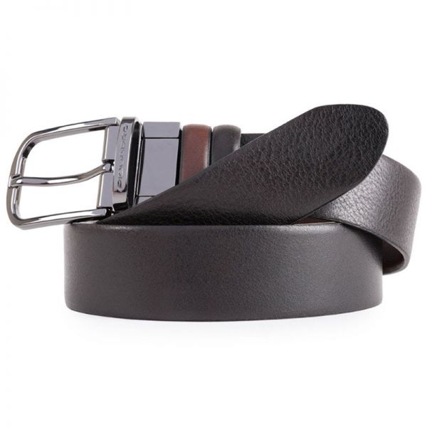 Замечательное дополнение к повседневному гардеробу современного мужчины - двусторонний классический ремень из гладкой натуральной кожи с черным кантом, коллекция Piquadro Black Square. В зависимости от случая аксессуар можно носить черной и коричневой стороной наружу. Ремень снабжен закругленной открытой пряжкой из темного металла.