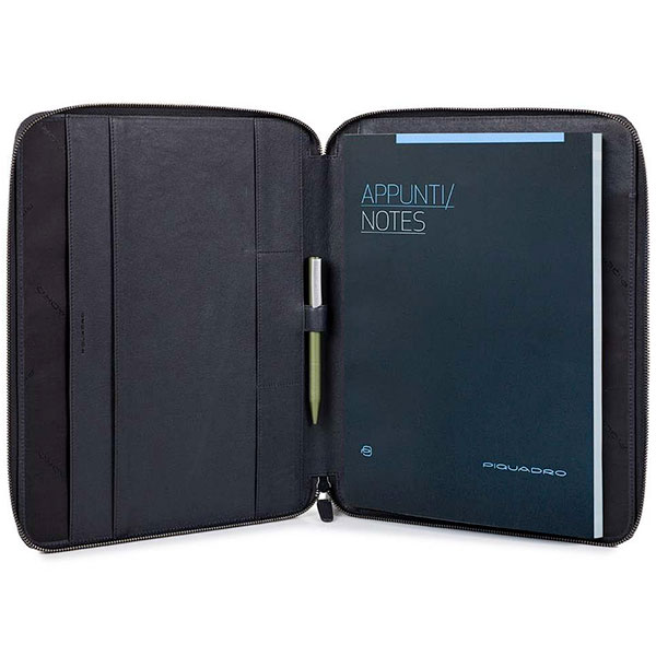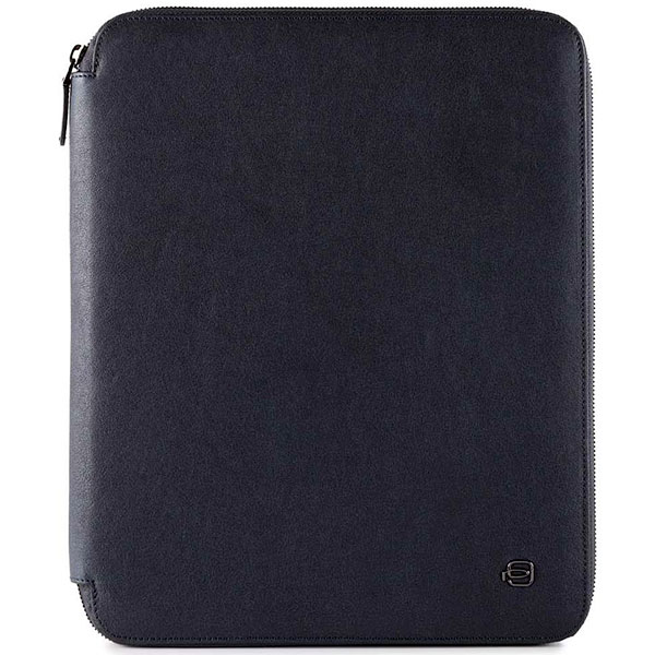 Тонкая кожаная папка для документов с отделением для ручек и застежкой-молнией от компании Piquadro, коллекция Black Square. Натуральная телячья кожа синего цвета.