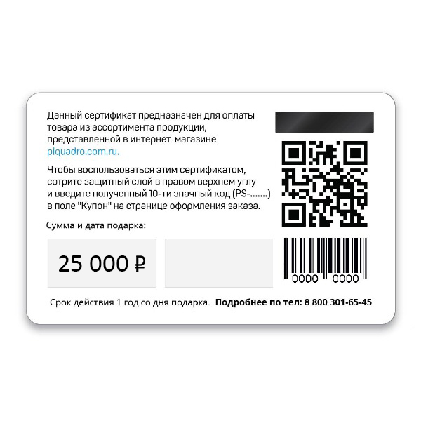Данный сертификат Piquadro на 25 000 рублей предназначен для оплаты товара из ассортимента продукции, представленной в нашем интернет-магазине https://piq.sale/