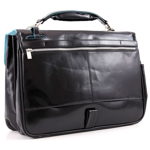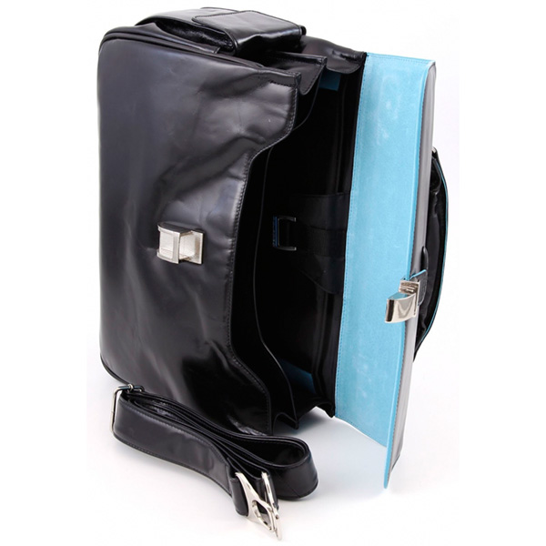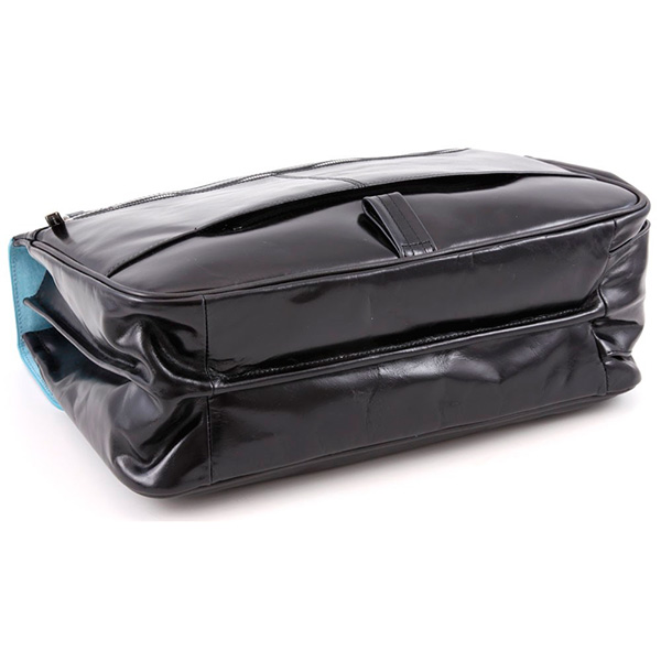 Кожаный портфель черного цвета с плечевым ремнем из коллекции Piquadro Blue Square. Компактный, но вместительный, благодаря своей ширине портфель. Имеет два отделения с отсеками под ноутбук и планшет, внутренний и внешний карман на молнии. Солидный внешний вид, мягкая телячья кожа и бирюзовая окантовка, делают его привлекательным и непохожим на другие портфели.
