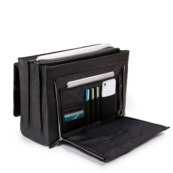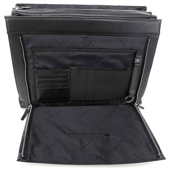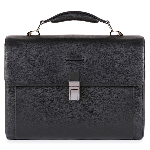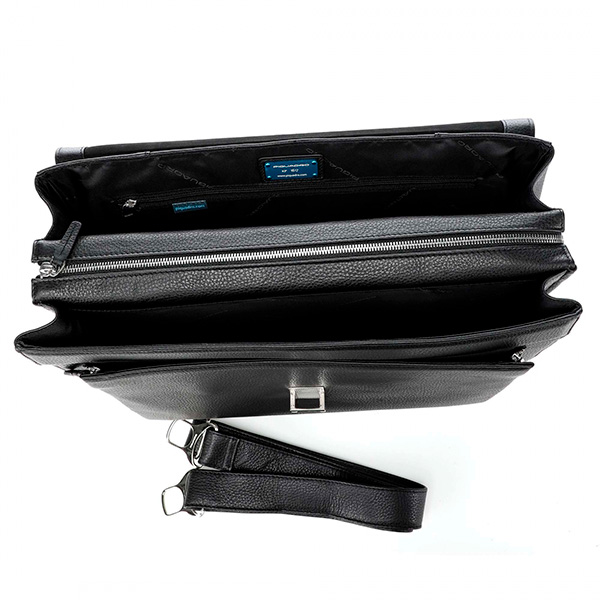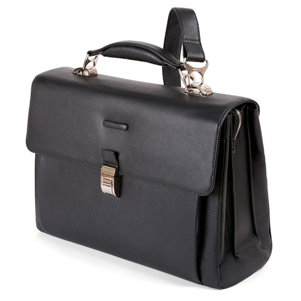 Солидный кожаный портфель с тремя отделениями из классической коллекции Piquadro Modus. Портфель изготовлен из структурной телячьей кожи. Имеет три отделение, одно из которых на молнии и с защитными-мягкими стенками, предназначено для 15,6 дюймового ноутбука, два других прекрасно подойдут для документов формата A4. На передней части портфеля расположен карман на молнии с отсеками для телефона, планшета, визитных карт и письменных принадлежностей. В комплекте с портфелем идет съемный плечевой ремень. Не смотря на свою высокую функциональность портфель не выглядит очень большим и идеально подходит для использования на каждый день.
