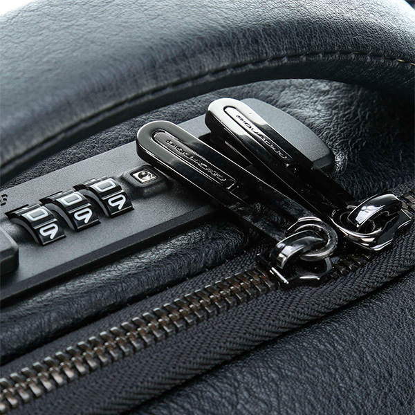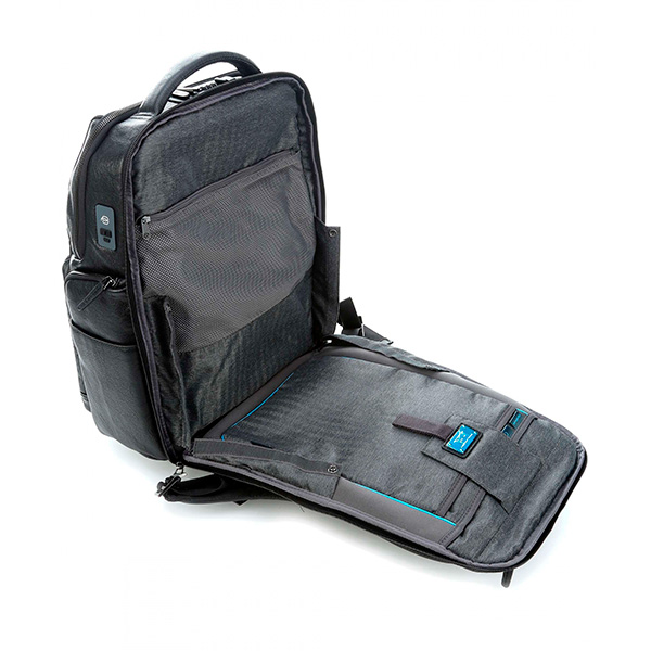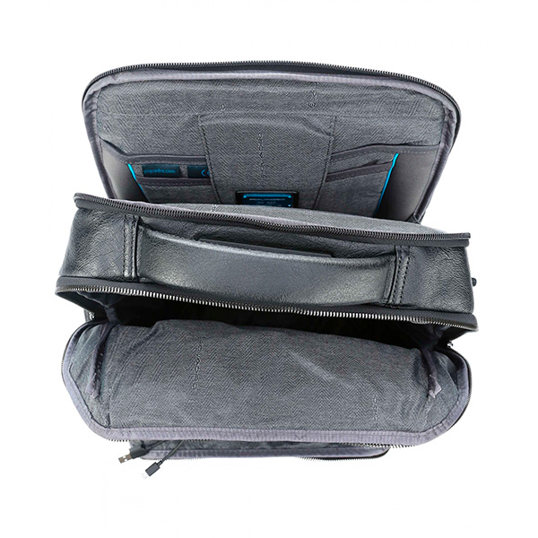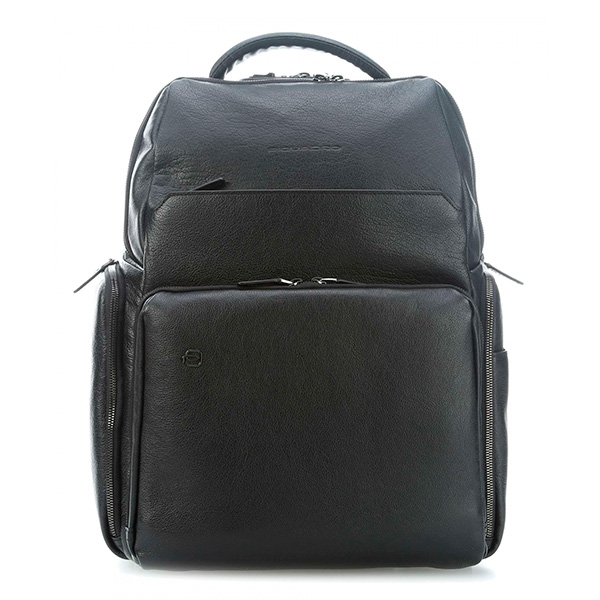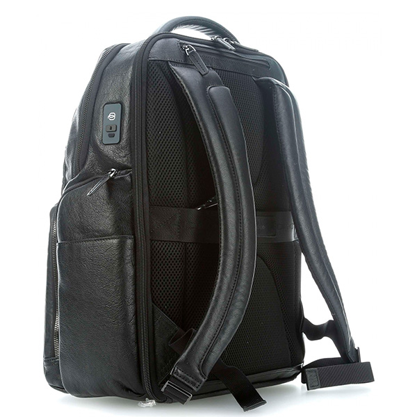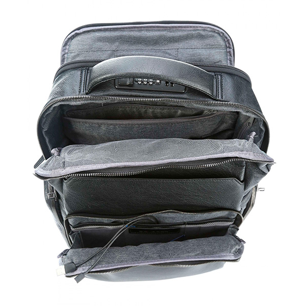 Премиальный кожаный бизнес-рюкзак из флагманской коллекции Piquadro Black Square. Изготовлен из высококачественной структурной телячьей кожи с черной окантовкой и черненой фурнитурой. Рюкзак имеет два отделения, одно из которых можно открыть на 180 градусов, что позволяет с легкостью разместить необходимые вещи, а также имеет два больших внешних кармана на молнии на передней стенке. В рюкзаке предусмотрены отсеки для 15.6 дюймового ноутбука и планшета, а также карманы для письменных принадлежностей. В качестве основных особенностей данной модели можно выделить кодовый замок, который сохранит содержимое Вашего рюкзака и антиворовской шнур, с помощью которого можно прицепить рюкзак и не беспокоиться, что его украдут. Внутри и на боковой стенке выведены разъемы USB, благодаря которым, подключив Power Bank, Вы сможете с удобством и в любое время подзарядить Ваши гаджеты. Один из боковых карманов предназначен для небольшого зонта и имеет сетку для отвода влаги, а в другой поместится небольшая бутылка с водой. На задней части рюкзака расположен карман на молнии, предназначенный для портмоне, и обладающий RFID защитой, которая не позволит считать информацию с Вашей банковской карты, а также крепеж на дорожную сумку и водонепроницаемый чехол, который защитит Ваш рюкзак и его содержимое от дождя и грязи.
