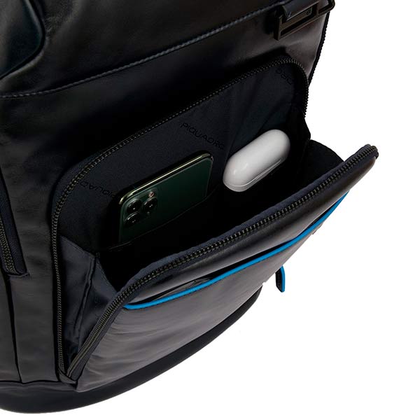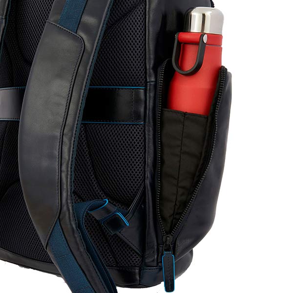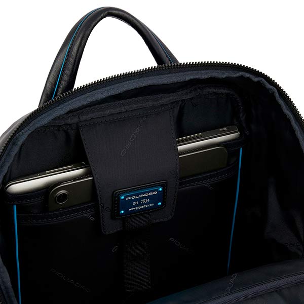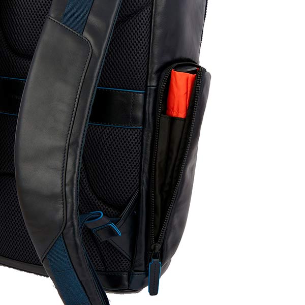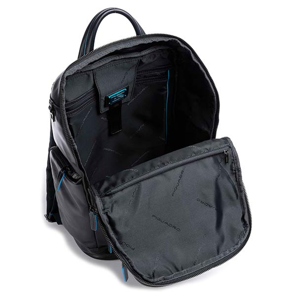 Рюкзак из коллекции Piquadro Blue Square. Изготовлен из мягкой телячьей кожи. Рюкзак имеет одно отделение в котором есть отсек для планшета и 14 дюймового ноутбука, два кармана на молнии на передней части и два кармана по бокам для зонта и бутылки