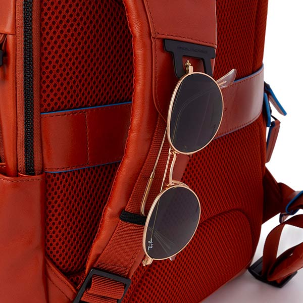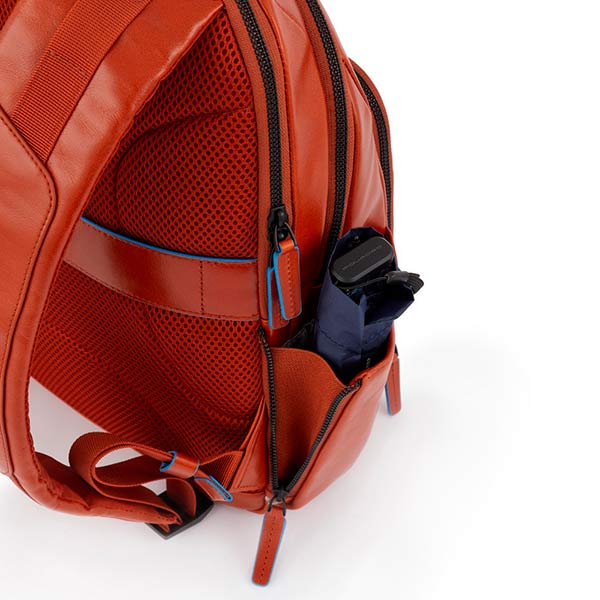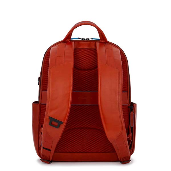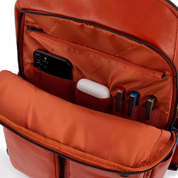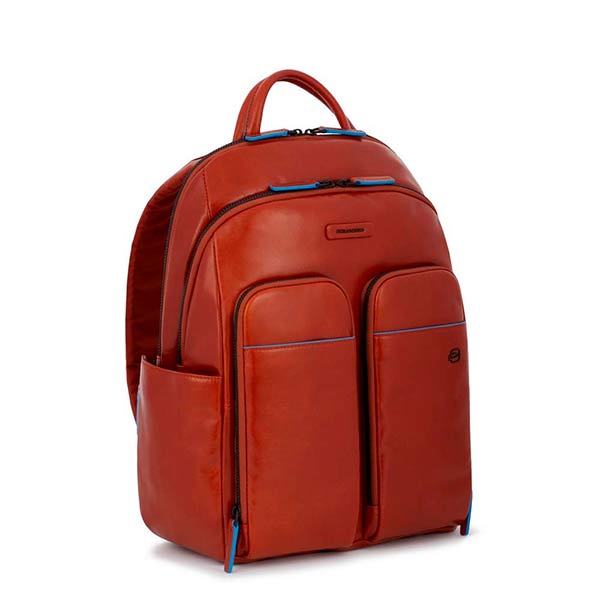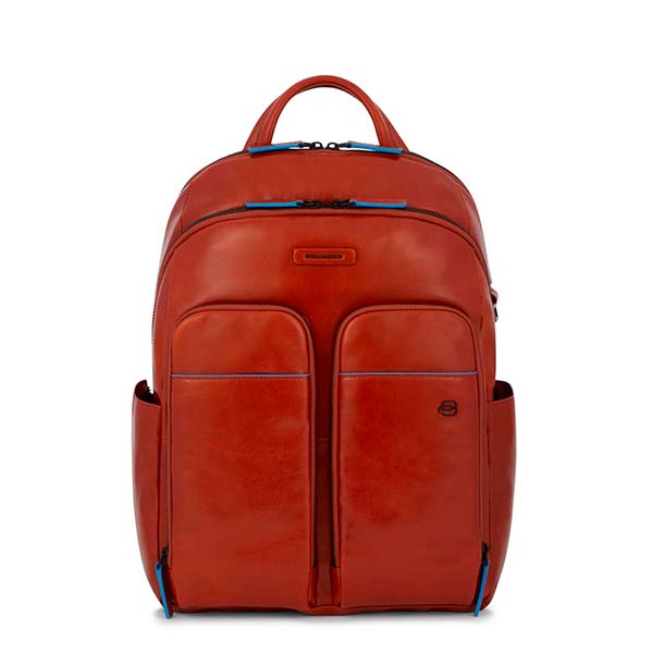 Стильный, кожаный рюкзак из флагманской коллекции Piquadro Blue Square. Изготовлен из мягкой телячьей кожи, фирменная окантовка бирюзовым кантом. Рюкзак имеет два больших отделения, в одном из которых находится отсек для 14 дюймового ноутбука и планшета, во втором отделении органайзер для письменных принадлежностей и отсеком для телефона. На боковой части рюкзака расположены карманы для зонта / бутылки. На передней части два не больших кармана.