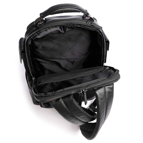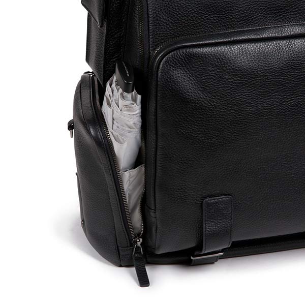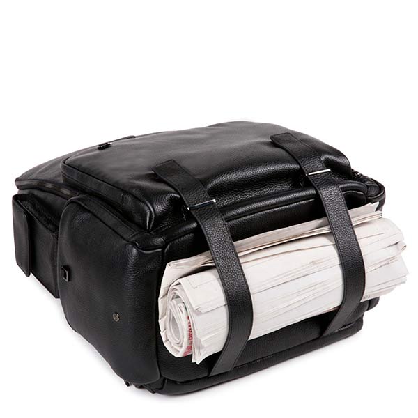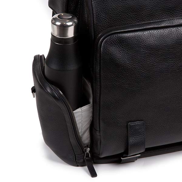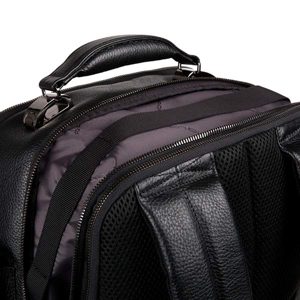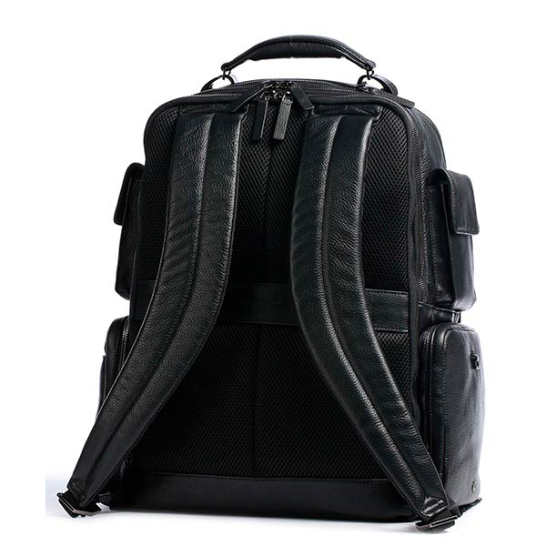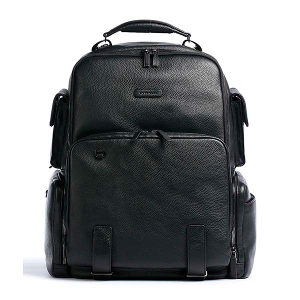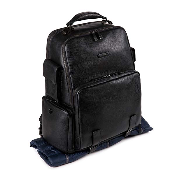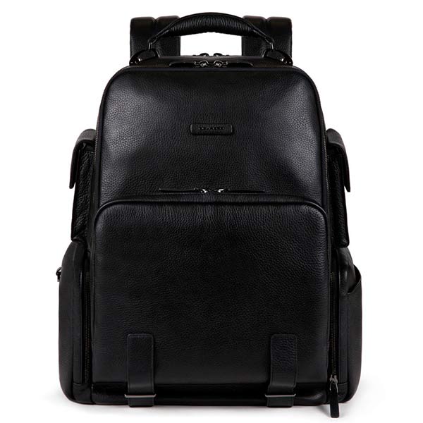 Большой и солидный кожаный мужской бизнес-рюкзак из коллекции Piquadro Modus Special. Изготовлен из превосходной зернистой телячьей кожи с черненой металлической фурнитурой. В рюкзаке предусмотрено три отделения, в одном из которых расположен отсек для 15.6 дюймового ноутбука и планшета, в другом карманы на молнии и места для телефона и письменных принадлежностей. Ещё одно отделение оборудовано съемным чехлом для маек и рубашек. По бокам расположены карманы для бутылки и зонта, сзади предусмотрен крепеж для дорожного чемодана и карман с RFID защитой для портмоне. Идеальный вариант вместительного рюкзака, как для бизнес-командировок, так и на каждый день.