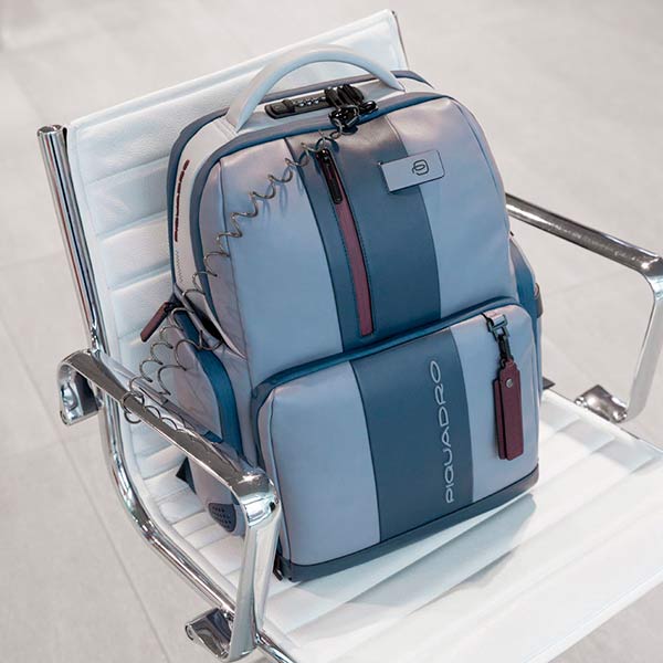 Кожаный бизнес-рюкзак среднего размера из коллекции Piquadro Urban. Рюкзак изготовлен из мягкой телячьей кожи с использованием черненой матовой фурнитуры. Имеет одно отделение с отсеком для 14 дюймового ноутбука и планшета. На передней части рюкзака расположен карман на молнии с отсеками для телефона и письменных принадлежностей, а также USB выходами для зарядки Ваших гаджетов, сбоку карман для бутылки, на задней части предусмотрено крепление на дорожную сумку. Рюкзак оборудован специальным шнуром, с помощью которого его можно пристегнуть и не беспокоиться, что его украдут. В комплекте с рюкзаком идет брелок в котором можно оставить свои контактные данные.