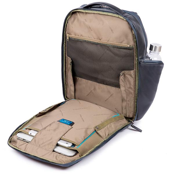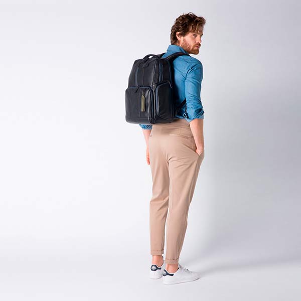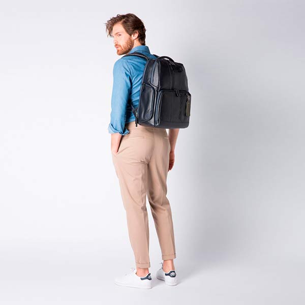 Кожаный бизнес-рюкзак из коллекции Piquadro Urban. Рюкзак изготовлен из мягкой телячьей кожи высочайшего качества с использованием матовой черненой фурнитуры. Это немного упрощенная флагманская модель рюкзака CA4550UB00BM, без "фишек", но все также с высокой функциональностью и превосходным дизайном. В рюкзаке предусмотрено 2 отделения, одно из которых имеет отсек для 15.6 дюймового ноутбука и планшета, сбоку расположен карман для зонта, спереди карман для телефона и ручек, на лямках предусмотрен держатель для очков и карман для пластиковой карты. На задней стенке рюкзака находится карман на молнии с RFID защитой, а также крепление на ручку чемодана.