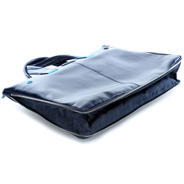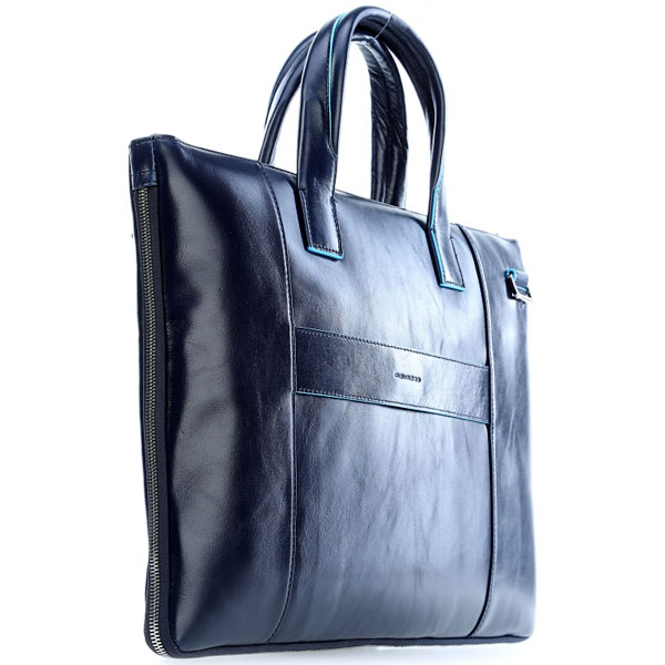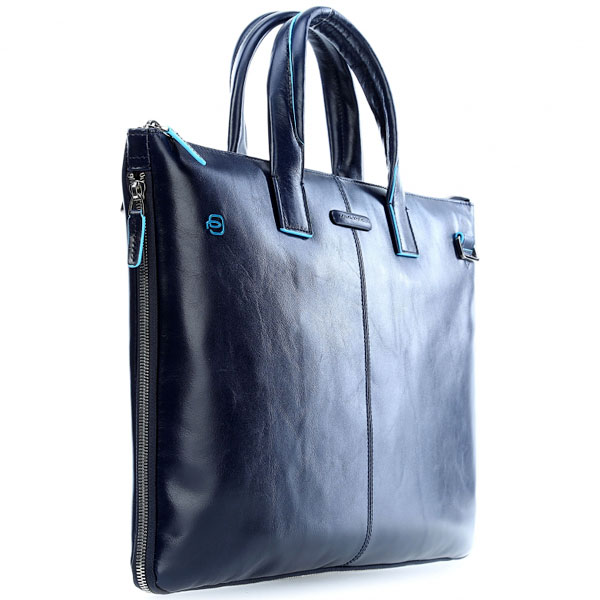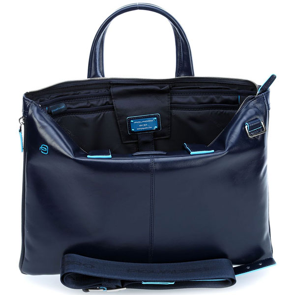 Тонкая деловая сумка для ноутбука с возможностью увеличения объема и отделением для iPad Air/Pro от компании Piquadro, коллекция Blue Square. Натуральная телячья кожа синего цвета.