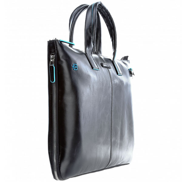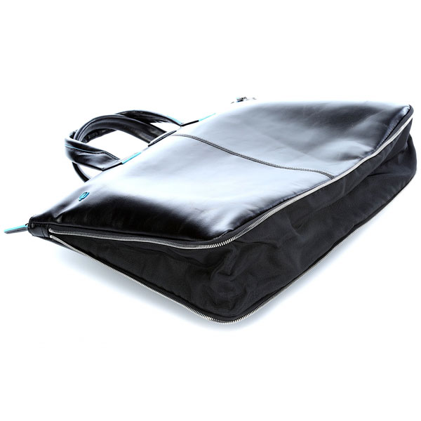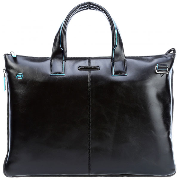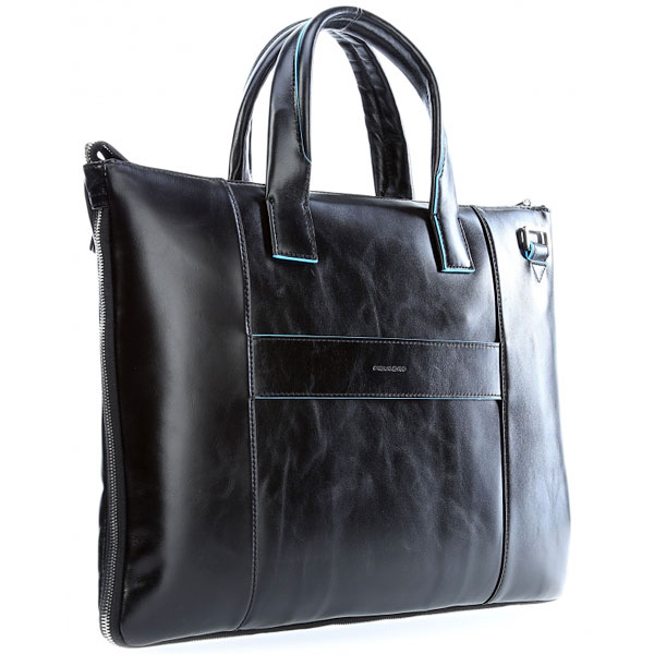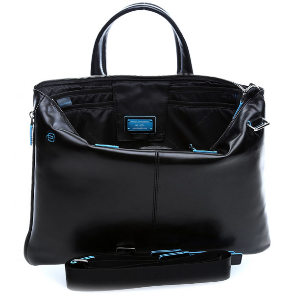 Тонкая деловая сумка для ноутбука с возможностью увеличения объема и отделением для iPad Air/Pro от компании Piquadro, коллекция Blue Square. Натуральная телячья кожа черного цвета.