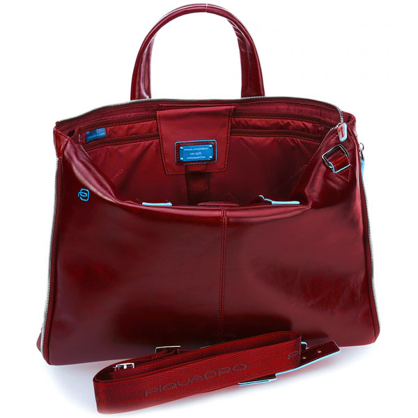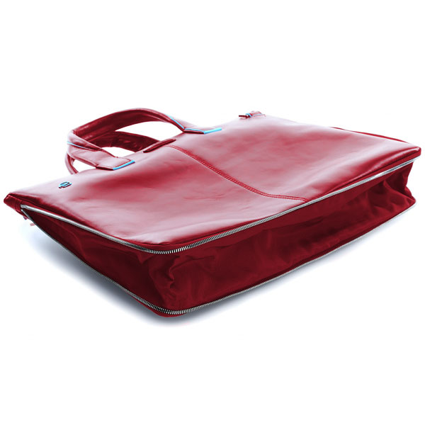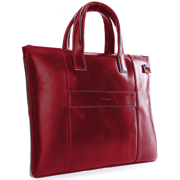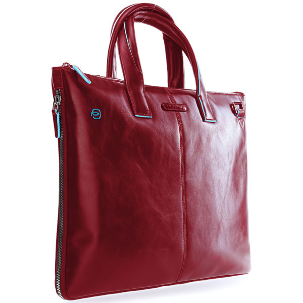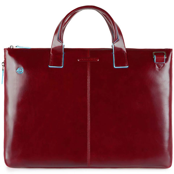 Тонкая деловая сумка для ноутбука с возможностью увеличения объема и отделением для iPad Air/Pro от компании Piquadro, коллекция Blue Square. Натуральная телячья кожа красного цвета.