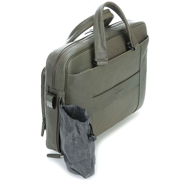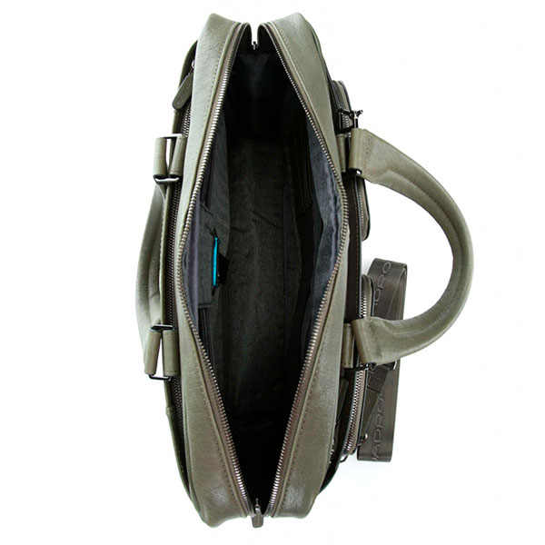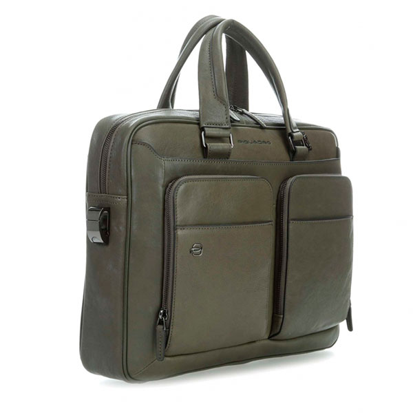 Мужская кожаная сумка зеленого цвета с одним отделением, отсеком под 15 дюймовый ноутбук и планшет, внутренними и внешними карманами на молнии, а также плечевым ремнем. Выполнена из телячьей мелкозернистой кожи с черненой фурнитурой. Новый цвет в коллекции Piquadro Black Square.
