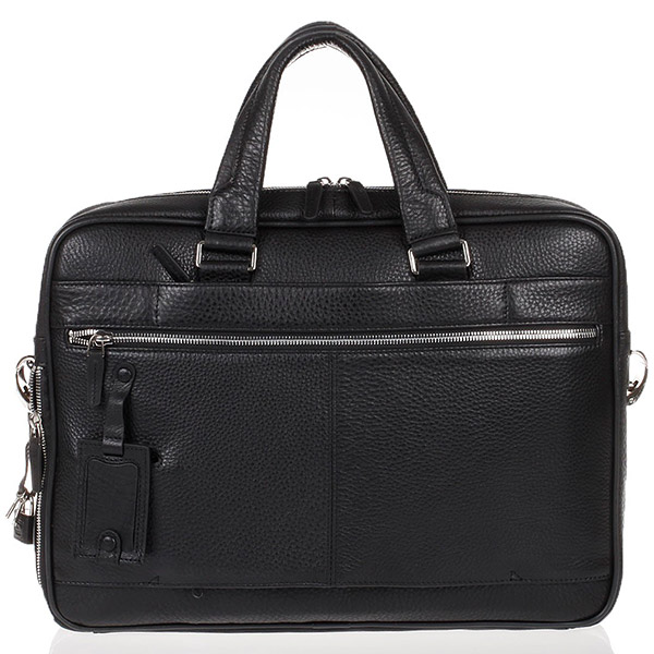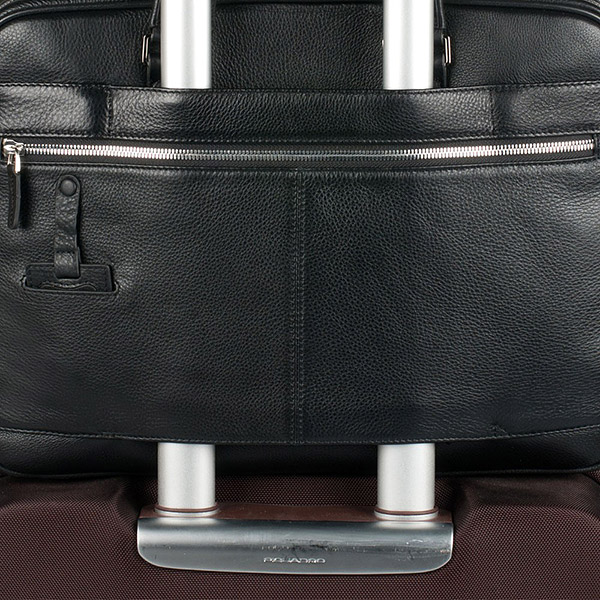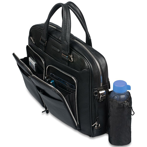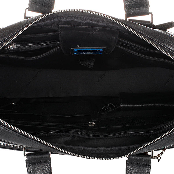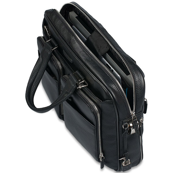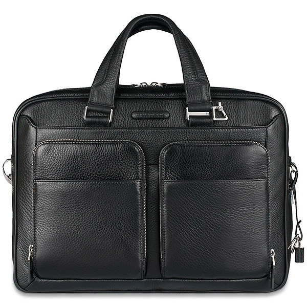 Тонкая деловая сумка для ноутбука с отделением для iPad Air/Air2, двумя передними карманами и двумя ручками от компании Piquadro, коллекция Modus. Натуральная телячья кожа черного цвета.