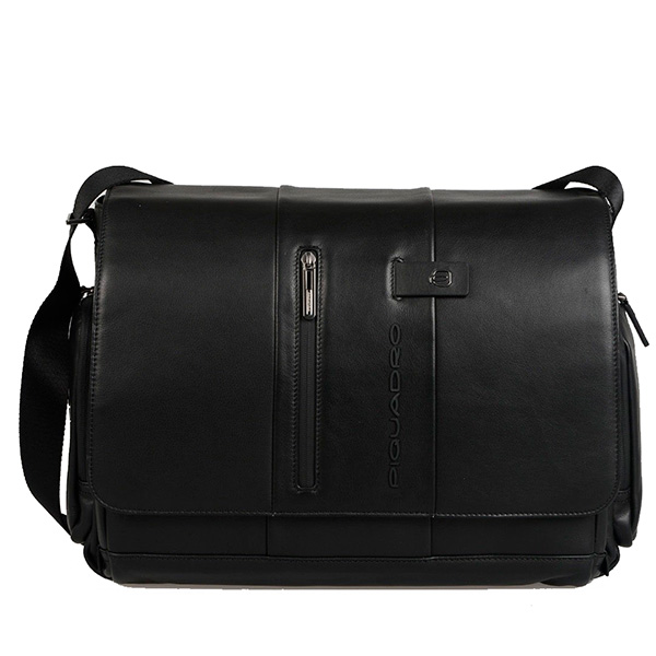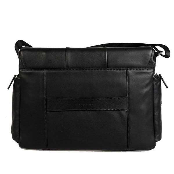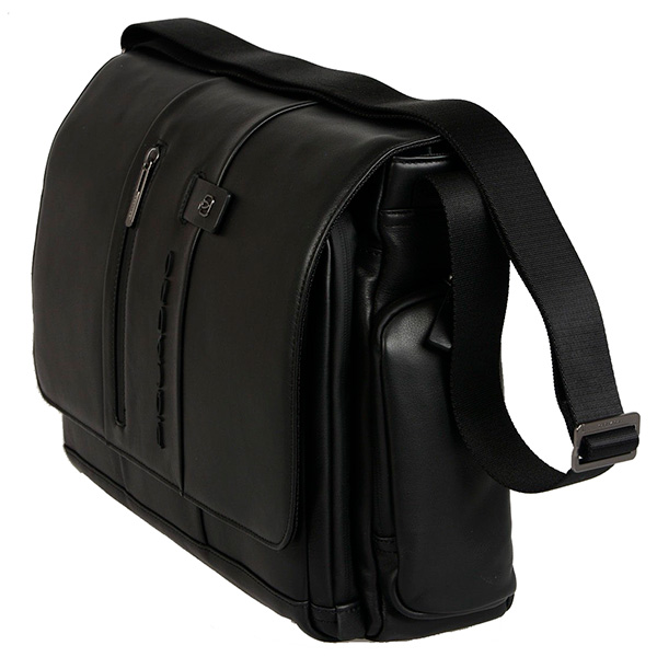 Кожаная мужская сумка-почтальон через плечо из новой коллекции Piquadro Urban. Сумка изготовлена из гладкой телячьей кожи с использованием черненой матовой фурнитуры. Имеет одно отделение с отсеком для 14 дюймового ноутбука и планшета, а также документов формата А4. Также спереди находится большой карман на молнии с отделениями для телефона и письменных принадлежностей. На задней стенке предусмотрена планка для ручки чемодана. По бокам расположены карманы на молнии с логотипом Piquadro.